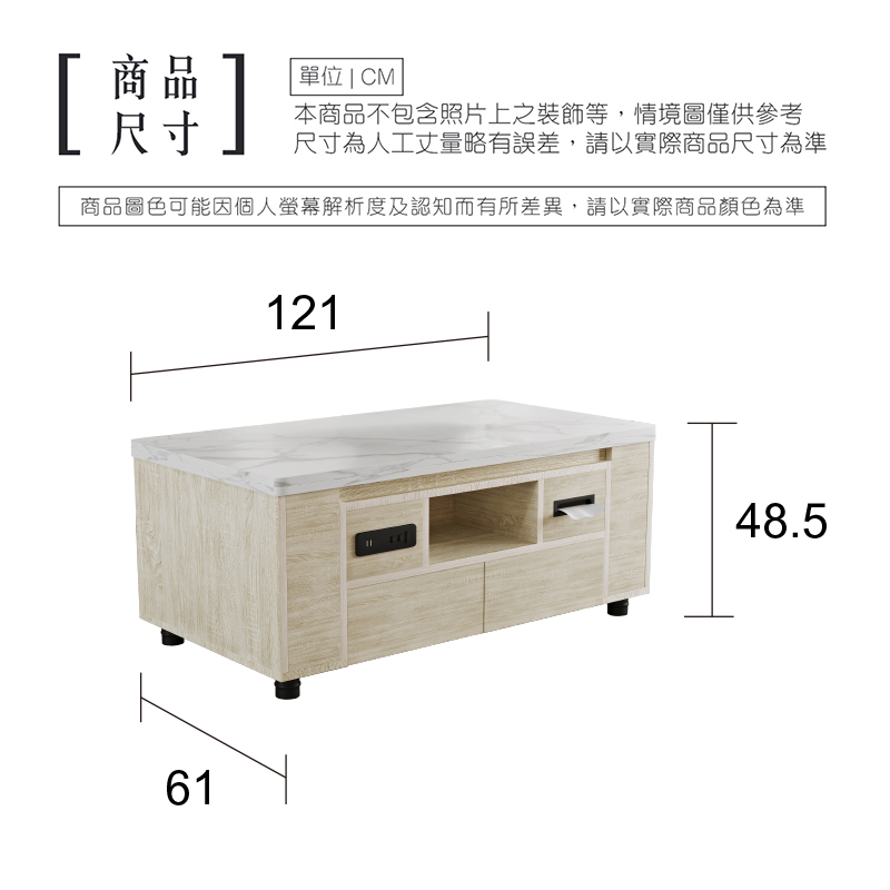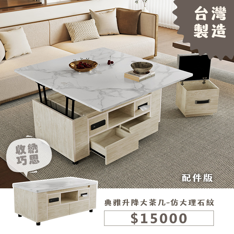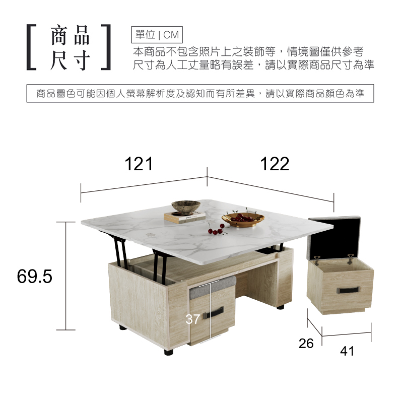商品介紹 升降桌:小戶型必備,茶几變餐桌 面紙孔:多功能造型+收納大空間 收納椅:附加兩個貓抓皮收納小椅 桌 面:木心板+美耐皿材質,提供三色選擇 插 座:USB x 2、二插 x 2、斷電開關 x 1 MIT:台灣在地製造,工廠新鮮配送 (圖為實際拍攝照片,注意螢幕均有色差)
