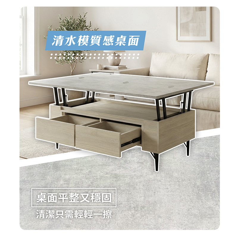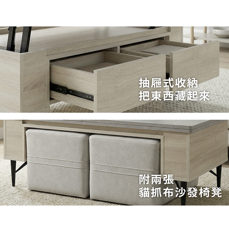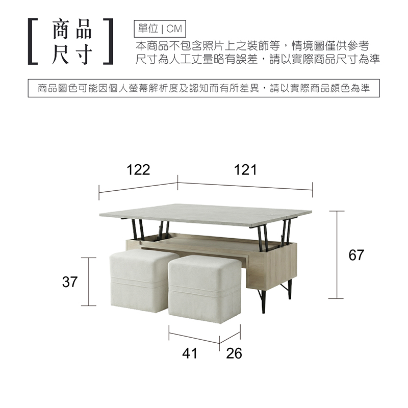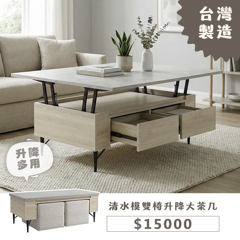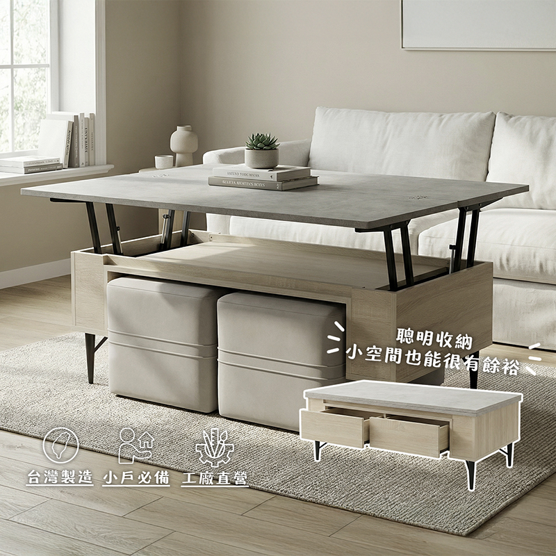 商品介紹 升降桌:小戶型必備,茶几變餐桌 機能強:多功能造型+收納大空間 小椅凳:附加兩個貓抓布小椅凳 桌 板:清水模質感材質,平整又穩固 MIT:台灣在地製造,工廠直營 (圖為實際拍攝照片,注意螢幕均有色差) 配送周期 商品下單至送達約需 2-4 周,實際配送時間依地區及路線有所不同,請以物流公司和您聯繫為主