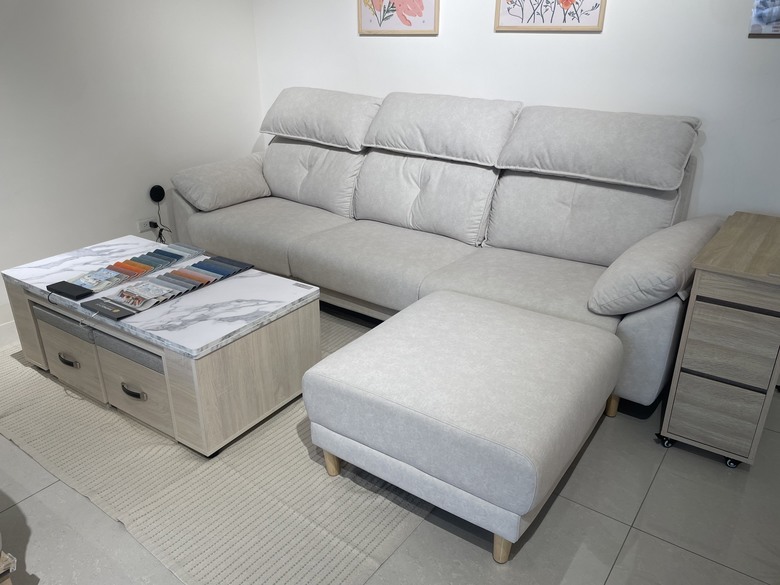 這位客人和家人來到門市時,門口的折疊桌立刻吸引了他們的目光,而各款沙發也都一一試坐——從坐感、支撐、到價格,每一項都讓他們印象深刻。
